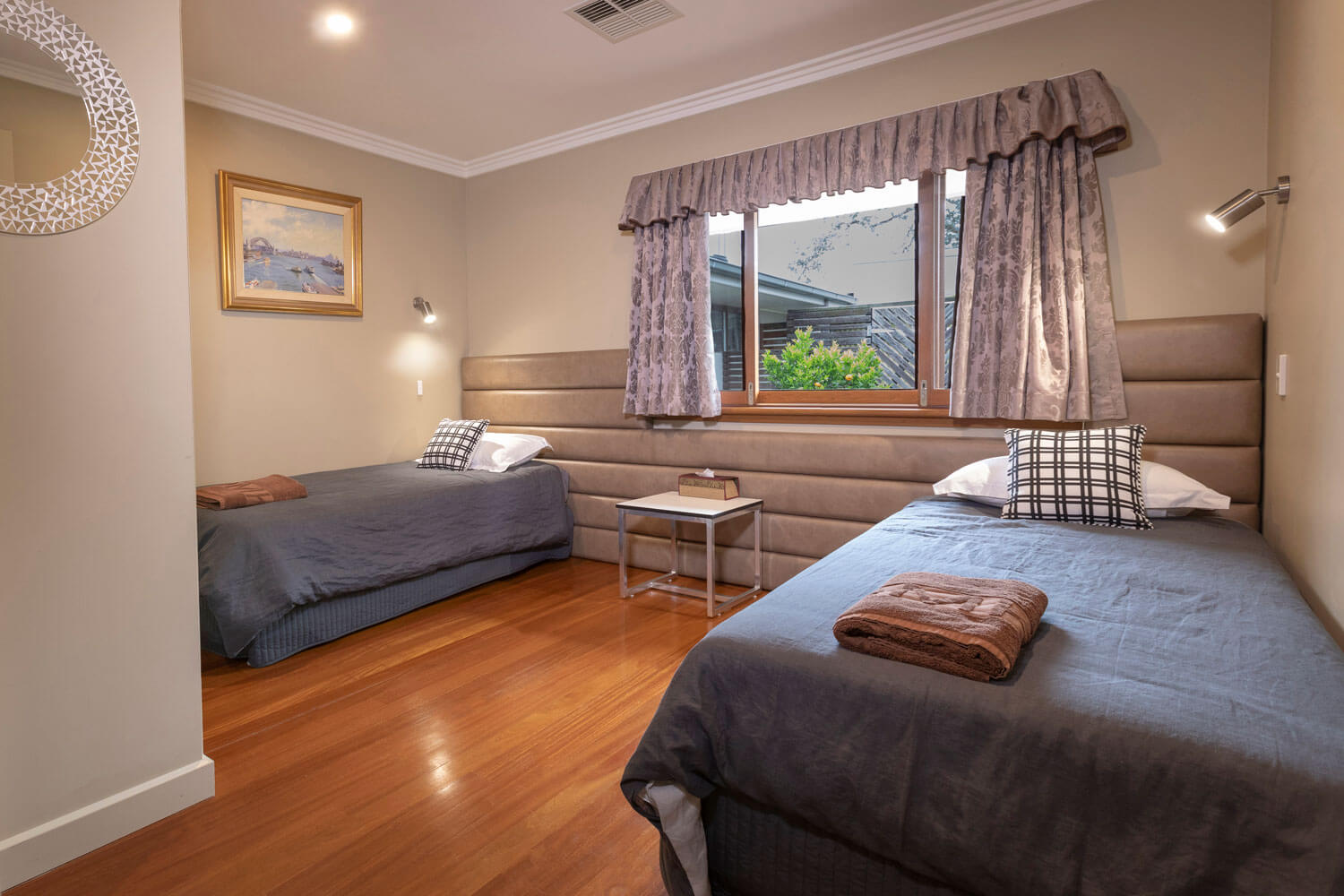At Dixieland Estate, we offer guest bedrooms appointed with beautiful furnishings and modern accents. Each of our 8 bedrooms is decorated with an eye toward comfort and understated elegance. Our bedrooms are configured to have 6 rooms consisting of king beds, and 2 rooms consisting of two single beds. We are unable to split king beds into singles; however, extra fold-out beds can be provided for $50 a bed, per stay, with linen provided.